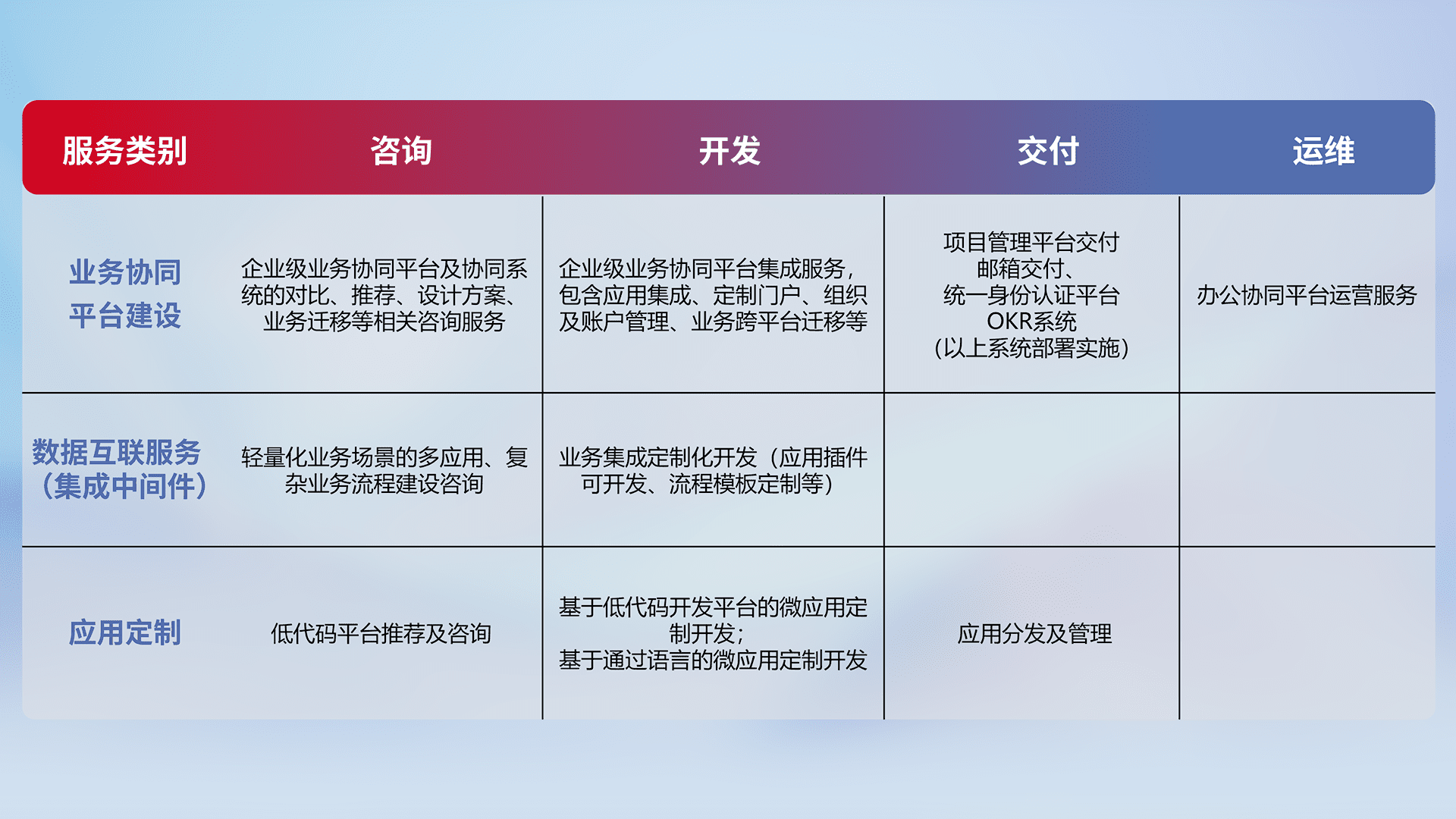 针对钉钉、、、、企微、、、、IDaas等平台级产品提供产品的规划、、、方案、、、、交付、、、、定制化开发等服务,,,,实现如统一协同办公、、、、智能客户服务、、混合会议管理、、、智能数据查询、、、等业务场景,,,,实现数字化转型。。